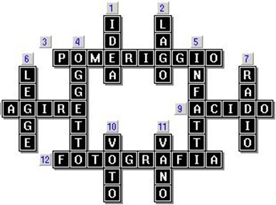 1- ایده، عقیده و نظر 2- دریاچه 3- بعد از ظهر 4- چیز، شی 5- در حقیقت، براستی 6- قاعده و قانون 7- رادیو 8- عمل 9- اسید 10- رای، رای دادن 11- عبث و بیفایده 12- عکسبرداری، فتوگرافی | Idea Lago Pomeriggio Oggetto In fatti Legge Radio Agire Acido Voto Vano Fotografia |