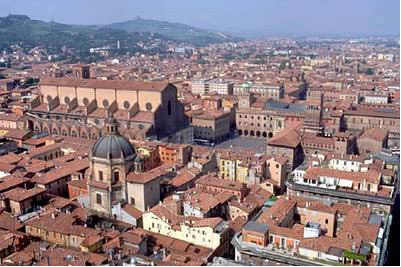 بولونیا مرکز بزرگ آموزش و فرهنگ در دوره میانه و اوایل رنسانس بود. در مرکز قرون وسطی ایی شهر ساختمانهای نما آجری و گچی سیمانی به رنگهای گرم، گذرگاههای مسقف با مغازههای کوچک، خیابانهای سنگ فرش شده زیاد و میادین بیشمار دیده میشود.